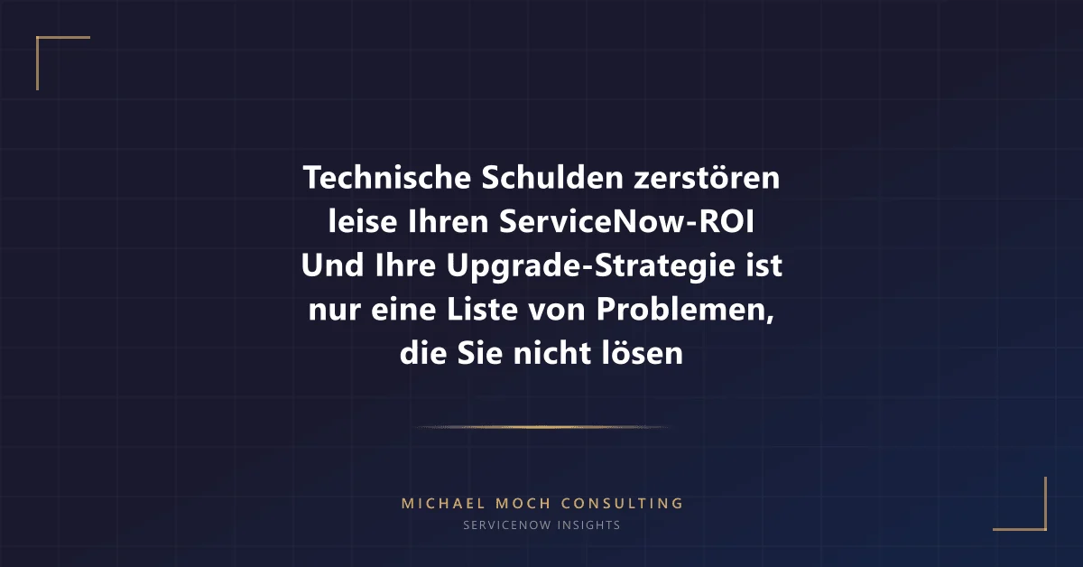 Technische Schulden zerstören leise Ihren ServiceNow-ROI Sie haben den Health Scan durchgeführt. Sie haben Instance Scan geöffnet. Vielleicht haben Sie sich sogar durch das Upgrade Center geklickt. Und dann ist